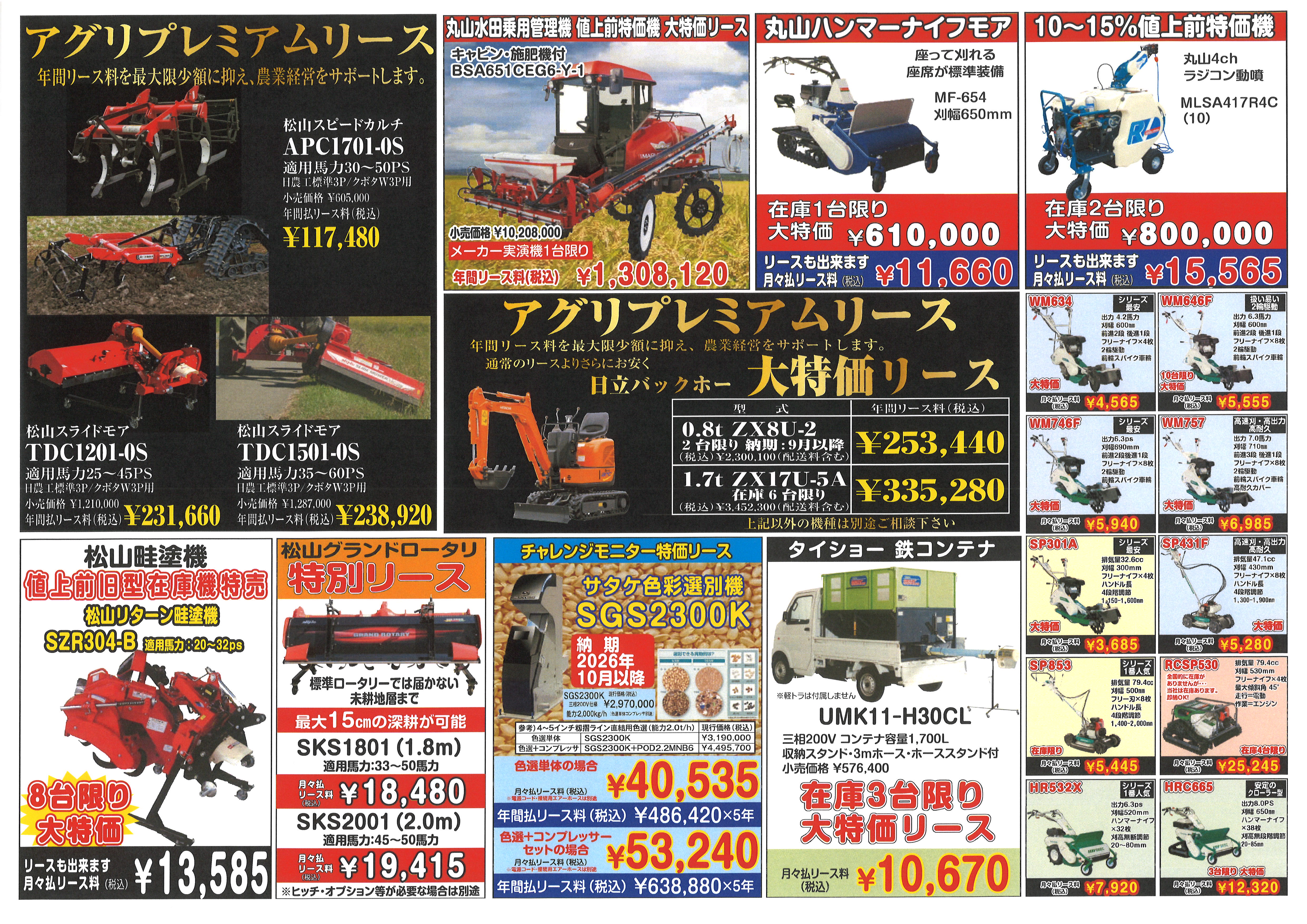 に 播州農機 2026 春の大感謝祭 を開催します。 ※4日間のみの開催です。日曜日は開催しておりません (開催時間 9:00~15:30 終了時間が早くなっていますのでご注意ください) 使用3~5年のリース終了機・特選中古機 【現品限りの大特価】 草刈はラジコンの時代 ラジコン草刈機 【1台限り 実演機特別リース】 アグリプレミアムリース 家庭菜園・小規模農家の方に特価でリースいたします 通常ローンより断然安い ご契約続々【自動車リース】6~7年